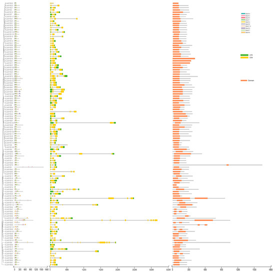 Conserved motifs, gene structures, and domains of the MYB gene family in E. ulmoides. Left: Different colored boxes represent different motifs and their positions in each EuMYB protein sequence. Middle: The green boxes represent UTR, black lines represent the intron regions, and yellow boxes represent CDS (exons). Right: The orange-red boxes represent domains.