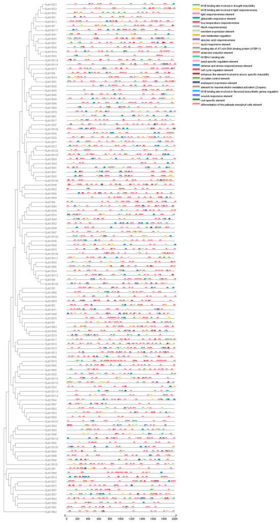 Cis-acting elements of the MYB gene family in E. ulmoides. The name of each regulatory element is shown on the right with different colors. The relative location of each element on each promoter can be estimated by the scale at the bottom.