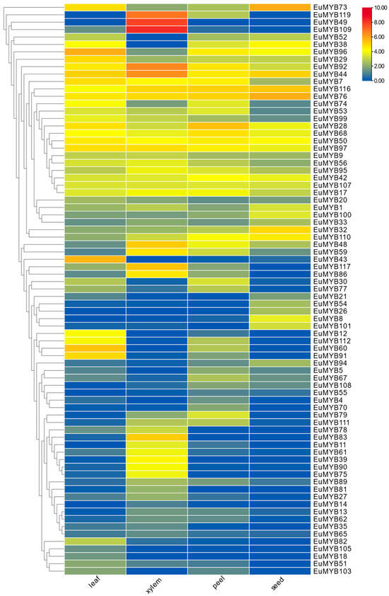 Expression profiling of EuMYB genes in leaf, xylem, peel, and seed. The figure only shows members with FPKM value > 1. Expression value is normalized to log2 (fragments per kilobase for a million reads, FPKM). Different colors represent different expression levels from low to high (blue–yellow–red).