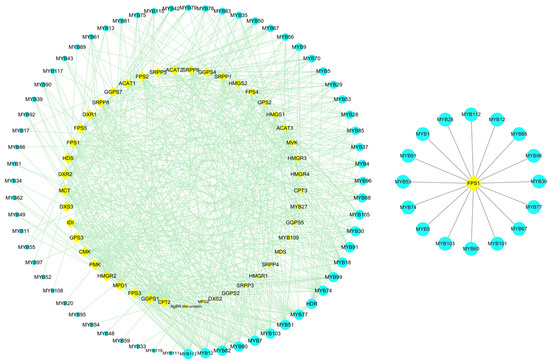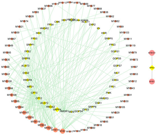 To research the possible regulating function between EuMYB and EUG biosynthesis genes, we constructed a co-expression network (Supplementary Table S7). The results showed that it had 510 pairs positively correlated between 45 EUG biosynthesis genes and 66 EuMYB genes (Figure 8 and Figure 9). Among them, EuMYB112 had the highest degree of connection, which was positively correlated with 20 EUG biosynthesis genes, followed by EuMYB12 (19), EuMYB51 (18), EuMYB60 (18), EuMYB77 (18), EuMYB82 (18), and EuMYB103 (18). At the same time, it had 198 pairs negatively correlated between 41 EUG biosynthesis genes and 57 EuMYB genes. Among them, EuMYB110 had the highest degree of connection, which was negatively correlated with 14 EUG biosynthesis genes, followed by EuMYB32 (13), EuMYB33 (13), EuMYB76 (12), EuMYB116 (12), and EuMYB101 (10). These genes may play a crucial role in regulating EUG biosynthesis. Additionally, a previous study indicated that farnesyl diphosphate synthases (FPS1) may be the key rate-limiting enzymes for EUG synthesis. Through our analysis, we found that there were sixteen EuMYBs that were positively correlated with the FPS1 structural gene, and two EuMYBs were negatively correlated with the FPS1 structural gene. We predicted that these EuMYBs may have a possible regulatory relationship with the FPS1 structural gene.