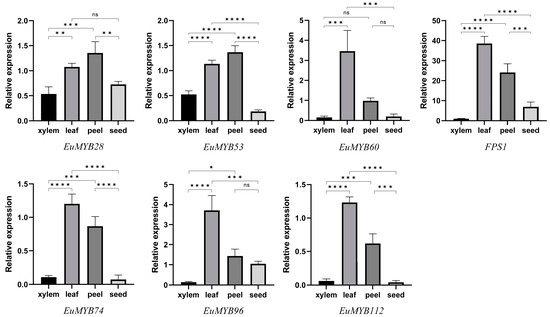 Expression levels of key rate-limiting enzyme FPS1 and six EuMYB genes in different tissues, as indicated by RT-qPCR. Error bars represent the standard deviations of three biological replicates. Gum-containing tissues (leaf and peel) and non-gum-containing tissues (xylem and seed) were used for the significance analysis. Different numbers of asterisks in the bars indicate significant differences in EuMYB expression levels of different tissues (ns: no significant difference, * 0.01 < p ≤ 0.05, ** 0.001 < p ≤ 0.01, *** 0.0001 < p ≤ 0.001, **** p ≤ 0.0001).