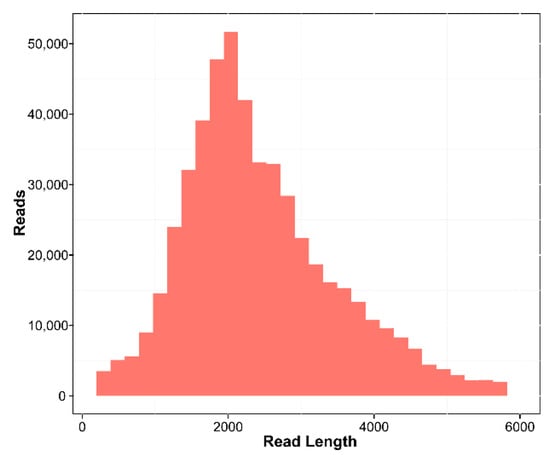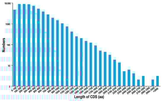 The CDS is the part of the mRNA responsible for encoding proteins. Using TransDecode software (version 5.5.0; GitHub, San Francisco, CA, USA), a total of 4797 complete ORFs were predicted, which were between 100 and 2300 bp in length (Figure 4).