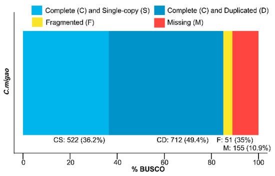 For the NGS transcriptome, after removing the sequencing connectors and primers and filtering out the low-quality data, the clean data (high-quality reads) were generated (Table S1). For the full-length transcriptome, 21 RNA samples obtained from the roots, stems, leaves, and fruits at four different developmental stages of C. migao were mixed and applied for library construction and third-generation sequencing. Finally, 39.9 Gb of raw data was obtained. Based on full passes ≥3 and sequence accuracy > 0.9, 515,929 CCSs were extracted from the raw data (Table 1).