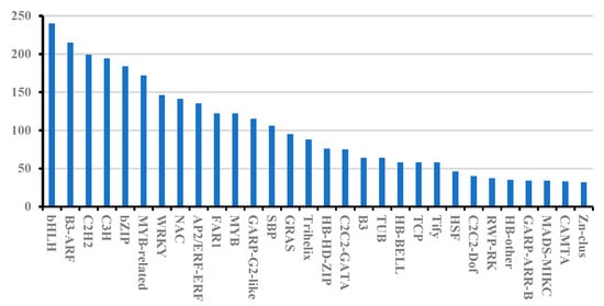 TFs, also known as trans-acting factors, refer to DNA-binding proteins that can specifically interact with the cis-acting elements and activate or inhibit the transcription of target genes. Thus, TFs directly control gene transcription levels and ultimately regulate the types and content of metabolites. The results showed that there were more than 3400 TFs in C. migao fruits. The top 30 TFs are illustrated in Figure 5; these include bHLH (240), B3-ARF (215), and C2H2 (199) TFs.