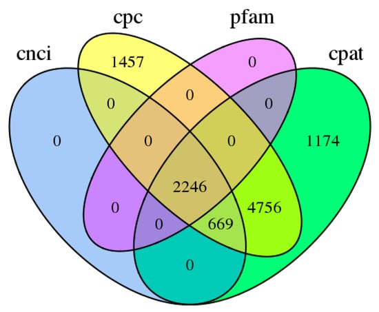 LncRNA is a non-coding RNA greater than 200 nucleotides in length that can interact with mRNA, DNA, protein, and even miRNA to regulate gene expression at epigenetic, transcriptional, post-transcriptional, translational and post-translational levels. Through CPS, CNCI, CPA, and Pfam analyses, the non-coding transcripts were identified and intersected to produce 2246 lncRNAs (Figure 6). The target genes of the lncRNAs were also predicted with the LncTar tool.