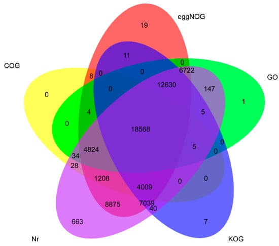 The obtained non-redundant transcripts were blasted with NR, Swissport, GO, KOG, Pfam, and KEGG databases for functional annotation. A total of 70,427 isoforms were successfully annotated, among which, 18,568 isoforms were simultaneously annotated within five databases (Figure 7). The NR database annotated the highest number of transcripts (70,212), and the COG database annotated the lowest number of transcripts (31,769).