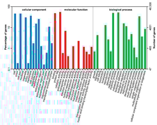 In order to comprehensively describe the properties of genes and their products in C. migao, the NR database was adopted for the functional annotation of all non-redundant transcripts. A total of 70,212 transcripts were annotated and classified into three categories according to their potential functions, including cellular components, molecular functions, and biological processes (Figure 8). For molecular functions, most of the annotated genes were involved in catalytic activity, binding, transporter activity, reproduction, and structural molecular activity. The main biological processes were the metabolic process, cellular process, single-organism process, biological regulation, and localization.