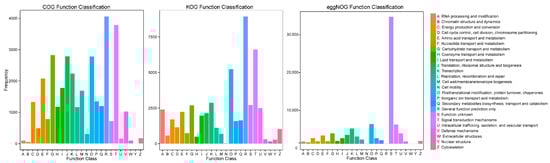 Meanwhile, gene functions were further analyzed using the COG, KOG and eggNOG databases, and 31,769, 45,834, and 69,253 transcripts were obtained, respectively. As a whole, all annotated genes were distributed in 26 biological processes (Figure 9). In the COG and KOG function classifications, “general function prediction only”, “signal transduction mechanisms”, “posttranslational modification, protein turnover, chaperones”, “transcription”, and “carbohydrate transport and metabolism” were the top five classifications. However, “function unknown” was more prevalent than the other categories in the eggNOG function classification.