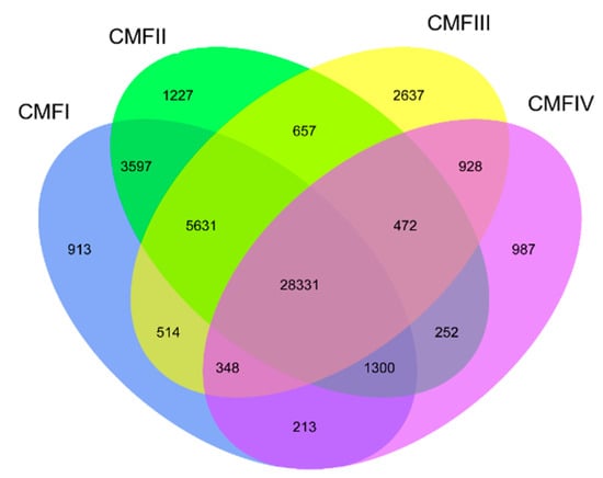 A total of 28,331 transcripts were expressed in all the CMFI, CMFII, CMFIII, and CMFIV fruits. Meanwhile, 5764 transcripts showed period-specific expression, with 913, 1227, 2637, and 987 transcripts specifically expressed in CMFI, CMFII, CMFIII and CMFIV, respectively (Figure 10).