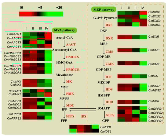 In the MVA pathway, 19 DETs were identified, including 4 CmAACTs, 3 CmHMGCSs, 4 CmHMGCRs, 2 CmMKs, 2 CmPMKs, 3 CmMDCs, and 2 CmFPPSs (Figure 12). In general, all DETs showed the highest expression in the CMFI or CMFII, and the lowest expression in CMFIV (Table S2). Of the four CmAACTs, only CmAACT3 showed the highest expression in CMFII. The other three CmAACTs, CmAACT1, CmAACT2 and CmAACT4, showed the highest expression in CMFIV and the lowest expression in CMFI or CMFII. Similarly, two CmPMKs were expressed in all stages, with the highest expression in CMFIII and CMFIV, respectively. Meanwhile, 15 DETs were involved in the MVA pathway, including 4 CmDXSs, 1 CmDXR, 1 CmCMS, 1 CmCMK, 1 CmICS, 2 CmHDSs, 1 CmHDR and 4 CmGPPSs. Most genes in the MVA pathway showed the same expression trends as those in the MEP pathway except for CmDXSs. Of the four CmDXSs, only CmDXS2 showed the highest expression in CMFII and the lowest expression in CMFIV. However, CmDXS1, CmDXS3, and CmDXS4 showed the highest expression in CMFIV or CMFIII. In addition, two CmIDSs, encoding products that catalyze the mutual transformation between IPP and DMAPP, were identified.