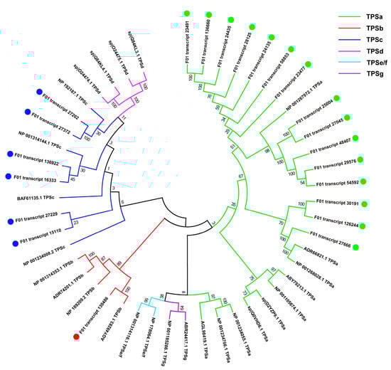 The FPPS and GPPS synthesized through the MVA and MEP pathways are used as raw materials for the biosynthesis of sesquiterpenoids and monoterpenoids, respectively. In C. migao fruits, the volatile oils are primarily composed of monoterpenoids and sesquiterpenoids, whose synthesis requires terpenoid synthases (TPSs). Therefore, 22 hub TPS genes with different expression levels were identified. The TPSs family consists of seven sub-families: TPSa, TPSb, TPSc, TPSd, TPSe/f and TPSg. Each sub-family exists in a special plant species or exerts specific functions. The phylogenetic tree illustrated that 15 TPSs belong to the TPSa sub-family, which is responsible for the biosynthesis of sesquiterpenoids (Figure 13, Table S3). Meanwhile, six TPSs were clustered into the TPSc sub-family related to diterpenoid biosynthesis. But only one TPS (F01_transcript_130486) belonging to the TPSb sub-family was responsible for the biosynthesis of monoterpenoids.