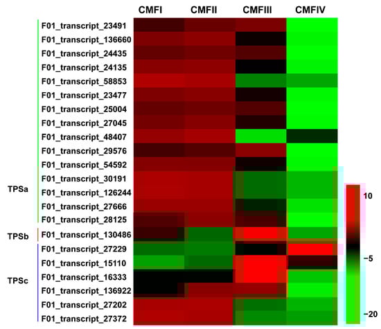 Most TPSs displayed similar expression trends, with the highest expression in CMFI or CMFII, and the lowest expression in CMFIV or CMFIII. However, two TPSs (F01_transcript_22652 and F01_transcript_27229) showed the highest expression in CMFIV, and four TPSs (F01_transcript_12629, F01_transcript_130486, F01_transcript_15110, and F01_transcript_16333) had the highest expression level in CMFIII (Figure 14, Table S4). These special TPSs require more attention in future research.