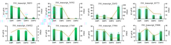 To determine the expression levels of the DETs, eight transcripts were randomly selected for a real-time quality polymerase chain reaction (RT-qPCR) test. Different from the other genes, F01_transcript_22562 and F01_transcript_17265 had the highest expression in CMFIV, not in CMFI or CMFII (Figure 15, Table S5). The RT-qPCR results showed that the expression trends observed in the eight genes tested were in good agreement with the NGS data, verifying the accuracy of the transcriptome data.