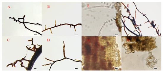 In September 2022, mycorrhizal formation was detected for the first time, but the infestation rate was low, and all the test seedlings were harvested in November to determine the colonization of truffles in pecan from the observation of root morphology, anatomical structure, and molecular identification. Under the illumination of a daylight-type light source, the mycorrhizae were seen with a stereomicroscope, and macroscopic aspects including color, form, branching, and the degree of mycelial looseness of the mycorrhizae were described in accordance with the method of Agerer [26]. Using a micrographic method, the morphological traits of mycorrhizae were documented. A mycorrhizal section was produced and Safranine and Fast Green double dyeing were used. Epiphytic hyphae and Hartig net (the structure through which EMF shares nutrients with the host plant, providing clear evidence of mycorrhizal development) should be observed. In addition, a section of mycorrhizal root was placed in a glass dish containing water, and the mantle was gently peeled off with tweezers and observed under a light microscope under a stereomicroscope. The smoothness of the surface of the mycelium, the diameter, length, sparseness and arrangement of the mycelium, and the presence or absence of epitaxial hyphae and cystidium were characterized.