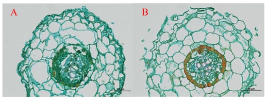 As shown in Figure 1, the root system of the pecan produced typical ectomycorrhizae after truffle inoculation. The root system was thicker than that of the uninoculated pecan seedlings, with more and shorter forks, the tips of which were frequently enlarged (Figure 1A,C), and the mycelia could be seen to be obviously extended from the roots when viewed under the microscope after being sliced (Figure 1E). Part of the root system can be observed to have a sheath-like structure called a mycorrhizal mantle, which is a black, rubbery-looking layer covering the surface of the roots (Figure 1F). Mycorrhizal mantle was peeled off with tweezers under the microscope and can be observed in the entangled epitaxial hyphae (Figure 1H), along with irregularly shaped epidermis cells (Figure 1G). Uninoculated seedling lateral roots were observed as being slender and relatively few in bifurcation (Figure 1B,D). Safranine and Fast Green double dyeing staining of mycorrhizal and control root cross sections revealed that the control roots’ cells were organized more sprawlingly and cleanly, and Hartig net development was not visible (Figure 2). In contrast, the cell arrangement in the cross section of the infected pecan roots was more wrinkled and compact. While the mycelium of EMF invaded the cellular interstices of the pecan root system’s epidermal layer, it did not reach the cortex, forming an obvious Hatty’s web structure that was consistent with the description of the typical ectomycorrhizal structure of angiosperms [36].