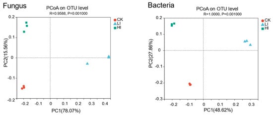 PCoA plots of soil fungal and bacterial communities of samples with different levels of infestation. Fungal communities are shown on the left and bacterial communities on the right. CK is the uninoculated control, LI is the low-infestation group, and HI is the high-infestation group. Note: X-axis and Y-axis represent the two selected principal coordinate axes, and the percentage indicates the value of the degree of explanation of the differences in the composition of the samples by the principal coordinate axes; the scales of X-axis and Y-axis are relative distances without practical significance; the points of different colors or shapes represent samples of different groupings, and the closer the points of the two samples are to each other, it indicates the more similar the composition of the two sample species is.
