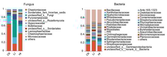 Family-level taxonomic composition of soil fungal-bacterial communities in Mycorrhizosphere pecan in different groups. CK is the uninoculated control group, LI is the low-infestation group, and HI is the high-infestation groupings.