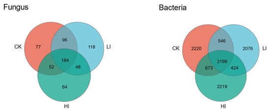 Venn diagrams of the unique and shared operational taxonomic units (OTUs) of soil fungal-bacterial communities in Mycorrhizosphere in different groupings. CK is the uninoculated control group, LI is the low-infestation group, and HI is the high-infestation groupings.
