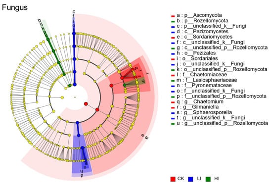 Fungal OTUs belonged to 9 phylums, 30 classes, 61 orders, 128 families, 224 genera and 315 species. According to PCoA analysis (Figure 3), the different infestation groups had significantly distinct fungal community structures (ANOSIM, R = 0.852, p = 0.001). Following the infestation of pecan seedlings by truffles, the mycorrhizosphere soil’s microbial community structure underwent significant alteration, with the highly infested group, the lowly infested group, and the uninoculated group being separated into three different species, demonstrating great specificity between groups. From the histogram of fungal community composition (Figure 4), it can be found that the abundance of Chaetomiaceae in the three groups of samples was very high, especially in the control group, which accounted for more than 60% of the total, and the abundance in the high-infestation group and the low-infestation group was a little lower, which was around 40% and 20%, respectively. Apart from Chaetomiaceae fungi, members of the Pyronemataceae family and certain members of the Sordariales order also have a high abundance. Furthermore, among the three sets of samples, a number of unclassified fungus made up a sizeable fraction, with their share topping 40% in the LI group. The Wayne diagram (Figure 5) showed that the HI group enjoyed 64 specific fungal OTUs, the LI group 118, and the CK group 77, for a total of 184 OTUs among the three groups. The differential marker fungi in the high-infestation group, according to the LEfSe analysis results (Figure 6) (LDA > 4, p < 0.05), were Rozellomycota and lasiosphaeriaceae. Sphaerosporella and an unclassified fungus were among the marker flora in the low-infestation group, while Chaetomium and Gilmaniella were mostly found in the phylum Ascomycetes in the marker flora of the control group.