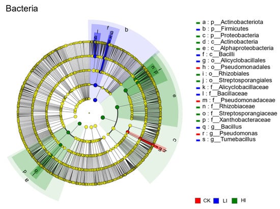 The 16S sequencing results obtained a total of 618,155 sequences, which were classified into 10,357 bacterial OTUs, and as shown in Table 4, the number of OTUs in the three treatment groups averaged between 2965 and 3169, which did not result in a significant difference, but unlike the fungi, in terms of α-diversity, the bacterial diversity in the three groups of samples was very low, and the Shannon indexes in the CK group and the HI group were The Shannon index was significantly higher in the CK and HI groups than in the LI group. The Simpson index was significantly higher in the LI group than in the CK and HI groups, whereas there was no statistically significant difference in bacterial abundance and diversity between the CK and HI groups.