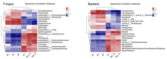Heat map of correlation between relative abundance of dominant soil microorganisms and soil chemical properties. the horizontal and vertical axes indicate the top 20 microbial species in terms of soil chemical properties and relative abundance, respectively. *, **, *** denote p < 0.05, p < 0.01, and p < 0.001, respectively. AP, AK, and Ca are effective phosphorus, effective potassium, and exchangeable calcium contents, respectively; NO3−-N and NH4+-N are nitrate nitrogen and ammonium nitrogen contents.