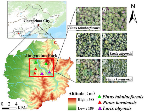 This study was conducted in Jingyuetan National Forest Park (125°44′–125°50′ N, 43°77′–43°79′ E), Changchun City, Northeast China. Changchun City is located in the warm temperate zone, which is a continental monsoon climate area [42] with an average annual temperature of 7.1 °C, average relative humidity of 69%, annual precipitation of 662 mm and annual sunshine duration of 2688 h. The main soil types are black soil, meadow soil and chernozem [43]. The main conifer species in the study area are Larix olgensis, Pinus tabulaeformis, Pinus koraiensis and Pinus sylvestris. The main broad-leaved tree species are Populus davidiana, Quercus mongolica and Tilia mandschurica.