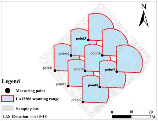 An LAI-2200C plant canopy analyzer (LI-COR, Lincoln, NE, USA) was used to measure the LAIe of sample plots. The data were obtained on 25 July 2022. Nine sample points with a distance of 10 m were measured sequentially in the same direction, and the covering cap was selected to be 90° [25], as shown in Figure 2. To avoid the influence of low vegetation in the forest, the analyzer was set at 1.5 m height, and each point was measured 3 times. The average LAIe was used as the measured value of the sample plot (Table 1). To reduce the measurement errors caused by light conditions, the measurements were taken before 9:00 am and after 16:00 pm. The tree height and DBH of each tree were measured with TruPulse 200L (Laser Technology, Inc., Centennial, CO, USA) and a diameter ruler.