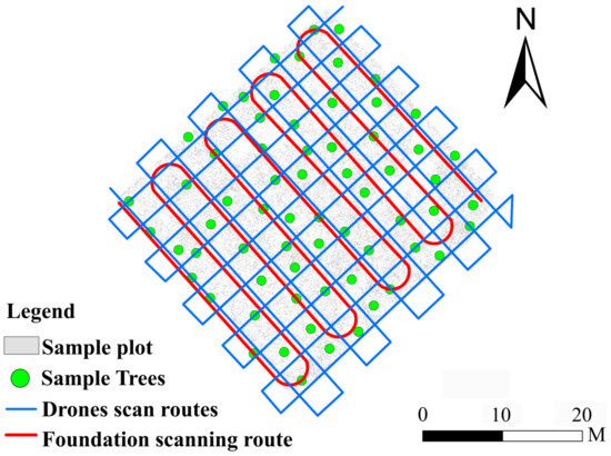 Laser radar scanning route map. Note: the red line was the route of the ground-based laser scanner, blue line was the route of the airborne scanner, and green dots were the location of trees in the sample plot. This map shows the C L. olgensis forest plot.