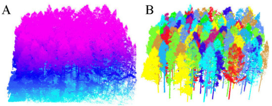 Comparison of point cloud data before and after processing. Note: (A) is the map of the point cloud before processing and (B) shows the map after processing. This map shows the C L. olgensis forest plot.