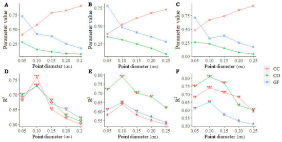 Figure 5A–C show the changing trends of forest structure parameters of different forest types at different point diameters. At different sizes, the values of CC, GF and CO were significantly different. When the point diameter was 0.05 cm, CC was 0.41, GF was 0.73 and CO was 0.28 in the P. tabulaeformis forest. Meanwhile, when the point diameter was set to 0.25 cm, CC, GF and CO were 0.91, 0.17 and 0.07, respectively. The CC value gradually increased with the increase in point diameter. On the contrary, the trend of GF and CO decreased gradually, and the change trend of the three forest types was the same. When the point diameter was 0.15 cm, the value of GF in the P. tabulaeformis forest decreased by 0.2 compared with a 0.1 cm point diameter. Although the value of GF in the P. koraiensis forest increased by 0.3 from a 0.15 cm point diameter to a 0.1 cm point diameter, the overall trend decreased.