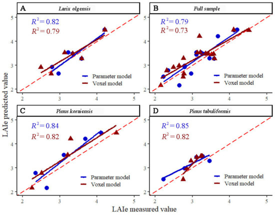 Comparison of multiparameter model and voxel model validation results. Note: (A) is the LAIe inversion model of L. olgensis forest, (B) represents the LAIe inversion model of the full sample, (C) is the LAIe inversion model of P. koraiensis forest, and (D) represents the LAIe inversion model of P. tabulaeformis forest. Red line is the voxel model, blue line represents the multiparameter model, and the red dashed line is the 1:1 relationship line. The blue dots represent the multiparameter model data and the red triangles represent the voxel model data.
