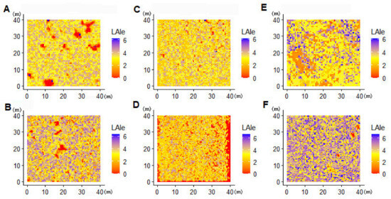 Spatial distribution of LAIe in each sample plot. Note: (A,B) are P. tabulaeformis forest, (C,D) are L. olgensis forest and (E,F) are P. koraiensis forest.