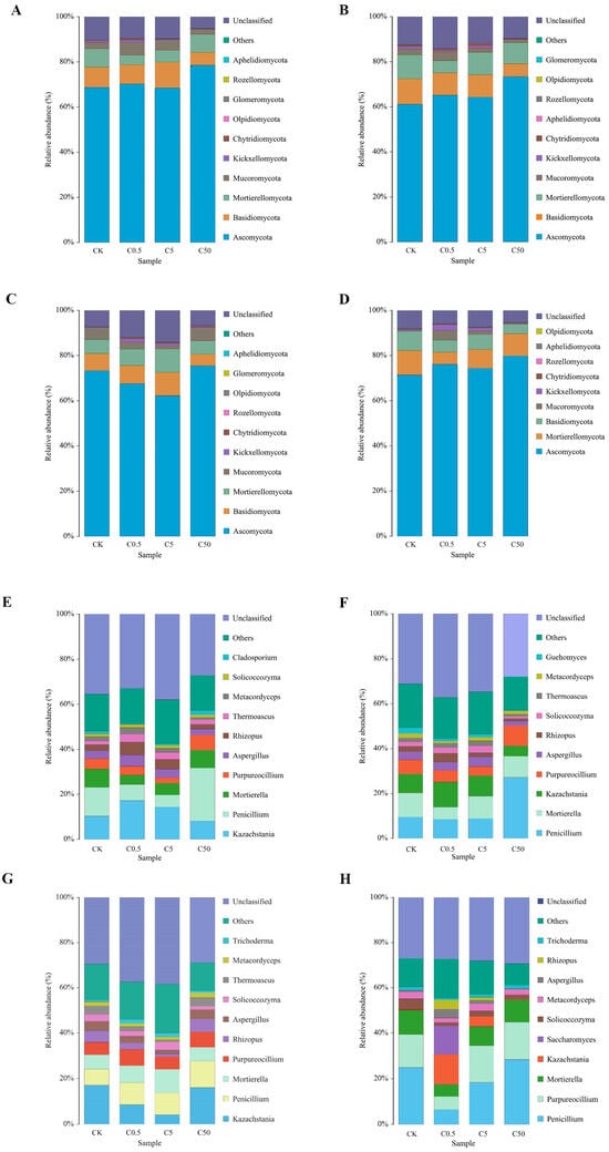 3.2.3. Effect of Different Concentrations of Curcin Treatment on the Composition of Soil Fungal Communities