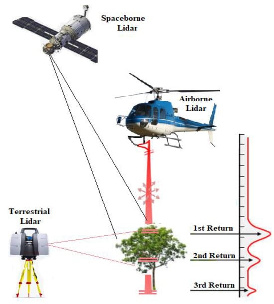 Airborne LIDAR measurements with sub-meter level accuracy have a significant impact on 3D imaging of forest patterns on the Earth’s surface. Many projects have employed airborne LIDAR systems with small footprints for mapping forest and vegetation cover for different purposes like biomass studies, forest inventory, and habitat modeling. The measurements taken by airborne systems with a small footprint (<1 m) can be classified as a discrete return or waveform return when the sensor is operating at 1064 nm infrared wavelengths and moving at low heights depending on the LIDAR measurement requirements and the presence of clouds. Small-footprint LIDAR systems record multiple sampled datapoints for specific sampled areas with good accuracies and this allows detailed sampling of forest structural components. Airborne LIDAR systems are commonly used in tropical areas to obtain valuable information over large areas to produce inventory samples for national and regional carbon quantification [26], or as wall-to-wall coverage [27].