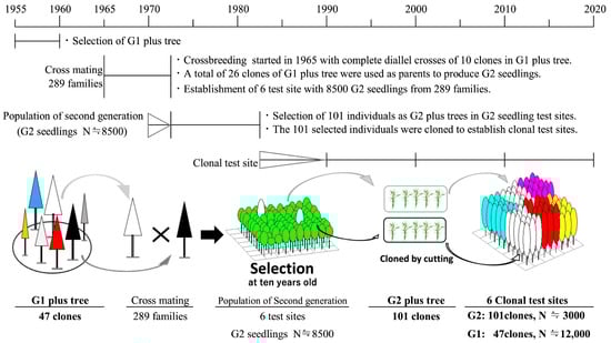The effectiveness of GP was tested in a two-generation population composed of selected individuals, which was created as follows. The first-generation (hereafter G1) plus trees consisted of 47 clones. G1 plus trees were selected mainly from planted forests in the 1950s by phenotypically comparing individual trees and selecting those with superior growth and shape around Saga Prefecture. Second-generation seedling individuals were produced from 1965 to 1972 using 26 unrelated clones from the G1 plus trees as founders with a mating design that included diallel crosses [,] (Figure 1). Approximately 8500 second-generation (hereafter G2) seedlings produced from about 300 combinations of parents were planted between 1969 and 1972 with lineage management. Test sites planted with G2 seedlings were established at six locations in Saga Prefecture, Japan []. Based on the results of a height and form survey conducted in the 1980s, when the G2 trees were approximately 10 years old, 101 individuals were selected as G2 plus trees and clonally propagated with cuttings. The G2 plus trees were selected based only on height data because equipment to measure wood stiffness in standing trees was not yet available and the pollen allergy problem was not recognized at the time.