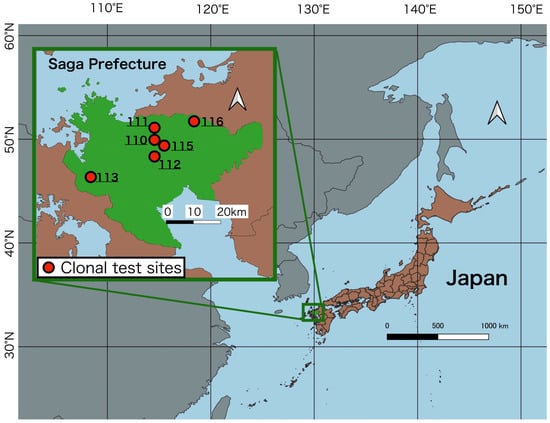 Locations of the clonal test sites in Saga Prefecture, Japan.