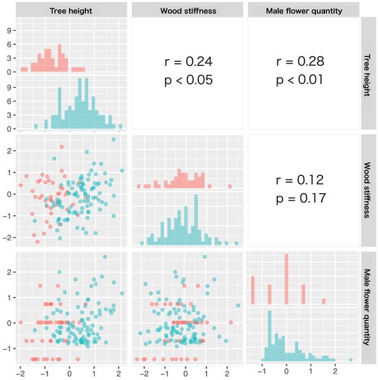 Figure 3 shows the comparison of clonal values between generations in each trait and the correlations between the clonal values for tree height, wood stiffness, and male flower quantity. For tree height, the clonal value of G2 significantly exceeded that of G1 (t = −10.4, p = 2.2e − 16). However, there were no significant intergenerational differences in wood stiffness (t = −0.08, p = 0.93, ns) or male flower quantity (t = −1.71, p = 0.09, ns). The Pearson’s correlation coefficients between the traits revealed weak correlations between tree height and wood stiffness (r = 0.24, p < 0.05) and between tree height and male flower quantity (r = 0.28, p < 0.01). There was no correlation between wood stiffness and male flower quantity (r = 0.12, p = 0.17, ns).
