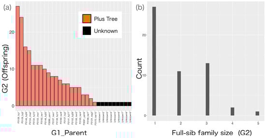 (a) Number of offspring in G2 per parent (G1_Parent). G1_Parent clones labeled “unknown” on the x-axis represent parents who were not assigned to any G1 clone by the CERVUS v.3.0 software. (b) Histogram of full-sib family size in G2.