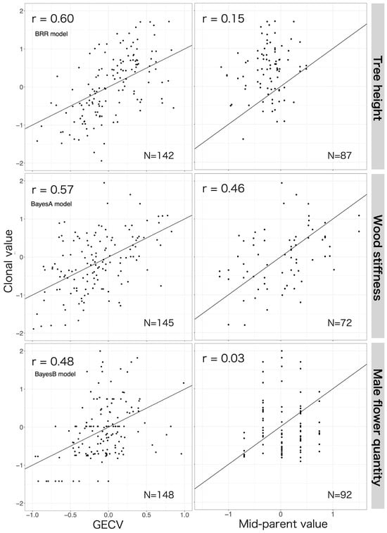 In the traditional pedigree-based approach, the clonal values of G2 clones are predicted to equal the mean of the parental breeding values. Therefore, in the absence of phenotype data, this approach predicts the same clonal value (known as the mid-parent value) for all offspring within a full-sib family []. The predicted clonal value of the offspring is obtained from the mean of the parental breeding values for the G1 trees. This would require phenotypic data of the complete set of 8500 G2 seedlings tested. However, the seedling population has now been drastically reduced, and parental information could not be recovered. Because the recent research in C. japonica breeding has shown that clonal value could potentially be used as a proxy for the breeding value [], the present study utilized the parental clonal value for the prediction of the clonal value of the offspring. To obtain the mid-parent value, the parents and their clonal values for the traits of interest must be known. A total of 87 of the G2 clones satisfied these requirements for tree height, 72 for wood stiffness, and 92 for male flower quantity. Predictive accuracy based on pedigree relationships in G2 clones was determined by calculating the Pearson’s correlation coefficient between the mid-parent value and the actual clonal value.