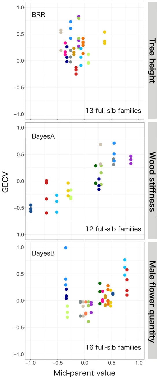 Male flower quantity in C. japonica is a highly heritable trait [] that is more easily predicted by GP than tree height or material quality []. However, the present results show that male flower quantity was more accurately predicted in the group without parent–offspring relationships between generations, even though this trait was not subjected to anthropogenic selection pressure. These discrepancies may be due to limitations on the accuracy of the clonal values based on field survey data. Male flower quantity differs from other traits in that it requires continuous surveys over multiple years to accurately determine each tree’s potential for male flower production, and the survey results used in this work were based on observations made over different periods for different groups (G1: 1988~1997, G2: 2008~2013). In addition, this trait is difficult to measure and is most accurately measured when surveyed by multiple people []. The correlation between clonal values and mid-parent values was also low for male flower quantity. Therefore, certain full-sib families have unnaturally large deviations from the relationship between the GECV and mid-parent value (for example, the full-sibs in the bottom row of Figure 6, which had the highest GECV for this trait but the lowest mid-parent value) should be re-examined to identify potential assessment errors. Much of the discussion about GP has focused on the benefits of using the vast quantities of genetic information provided by NGS technologies, but it is important to recall that it is also fundamentally dependent on reliable trait information, so compiling accurate trait information remains as important as ever []. One benefit of using GP is that it can reveal anomalies in trait information such as those mentioned above.
