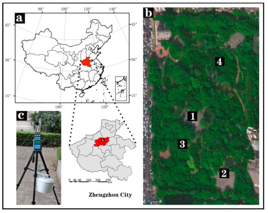 (a) Location of Zhengzhou; (b) Google Earth map of the study area, Lvyin Park and sample points include unshaded location (1) and (2), tree-shaded location (3) and (4); (c) measurement instruments.
