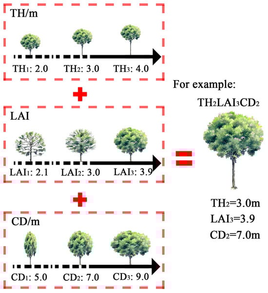The TCC and three tree morphological elements, i.e., LAI, TH, and CD, were set as the elements in this orthogonal experiment design. As shown in Table 2, the levels of each element were listed as Level 1, Level 2, and Level 3 successively. The levels were determined based on the common range values of each element. The specific approach was to calculate the common range of a particular element, divide it into three equal intervals, and take the average value of each interval as the three levels of that element in the simulation experiment. Regarding TCC, we used the remote-sensing image to calculate the TCC of all urban parks within the Zhengzhou city area, totaling 124 parks, and found that the TCC of nearly three-quarters of parks ranges from 60% to 90%. According to the aforementioned method, in this study, the levels of TCC were determined to be 65%, 75%, and 85% successively. Furthermore, based on the tree morphology data obtained from a field survey in Lvyin Park, the levels of three tree morphological elements were calculated using the same method. Among them, the common range for TH was from 1.5 m to 4.5 m, and the levels were determined to be 2 m, 3 m, and 4 m. The common range for LAI was from 1.6 to 4.4, and the levels were determined to be 2.1, 3.0, and 3.9. The common range for CD was from 4 m to 10 m, and the levels were determined to be 5 m, 7 m, and 9 m. In ENVI-met’s 3D plant editing tool (Albero), simulation-specific gridded tree modules can be generated by entering the appropriate combination of LAI, TH, and CD values [], as shown in Figure 2. In ENVI-met, tree modeling needs the leaf area density (LAD) rather than LAI. Therefore, Equation (3) [,,], which shows the relationship between LAD and LAI, was used to obtain the LAD of each height of the tree and consequently generate tree models with diverse CD and LAI. To avoid interference from quantitative factors, the other elements of the tree model, such as the albedo of leaves, and the depth of root and root area density, maintain the default settings.