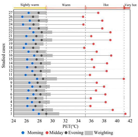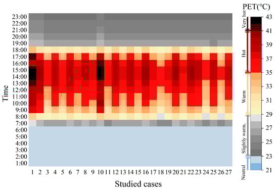 Initially, the analysis of PET variation within the park was performed to understand how the thermal environment of the studied cases changes within a day (Figure 3). Between 7:00 and 18:00, due to the influence of solar radiation, there are significant changes in the thermal environment within the park. PET fluctuates greatly, ranging from 25.3 °C to 43.0 °C. During this time, the extreme thermal sensation of “Very hot” appears, and the maximum difference in PET values is 8.94 °C among the 27 studied cases. In addition, the thermal environment did not change significantly during other periods not influenced by solar radiation, their PET values range between 22.1 °C and 27.5 °C, and the thermal sensation levels fall between “slightly cool” and “neutral”.