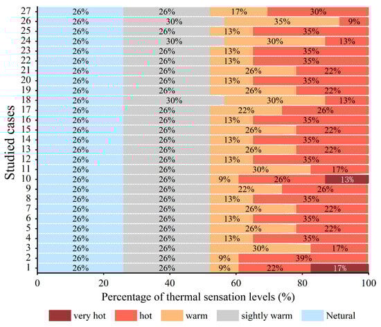 Percentage of thermal sensation levels throughout the day for 27 studied cases. Refer to Table 4 for thermal sensation level classification criteria.