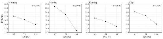 As shown in Figure 5, there is a downward trend in PET as the TCC increases continuously from 65% to 85%. It can be observed that as TCC increases, the average daily PET decreases by 1.51 °C. This indicates that TCC has the potential to improve the thermal comfort of the park. In addition, the R-value was able to reflect the differences in efficiency of TCC’s impact on PET at different periods of the day. The R-value rankings for each time period are as follows: midday (2.97 °C) > morning (1.16 °C) > evening (1.01 °C). This shows that TCC has the greatest effect on PET at midday, with an R-value approximately 2.5–3 times higher than in the morning and evening.
