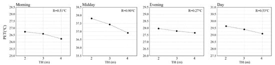 Changes in average PET values for three TH levels: morning (6:00–8:00), midday (12:00–14:00), evening (18:00–20:00), and the whole day (0:00–23:00).