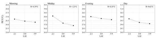 In the morning and evening, LAI has a smaller and more or less the same effect on PET, but the effect is visible in the midday, as shown in Figure 7. The R-value rankings for each time period are as follows: midday (1.23 °C) > morning (0.39 °C) > evening (0.35 °C). This difference is primarily due to the radiation variations between the periods.