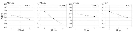 Changes in average PET values for three CD levels: morning (6:00–8:00), midday (12:00–14:00), evening (18:00–20:00), and the whole day (0:00–23:00).