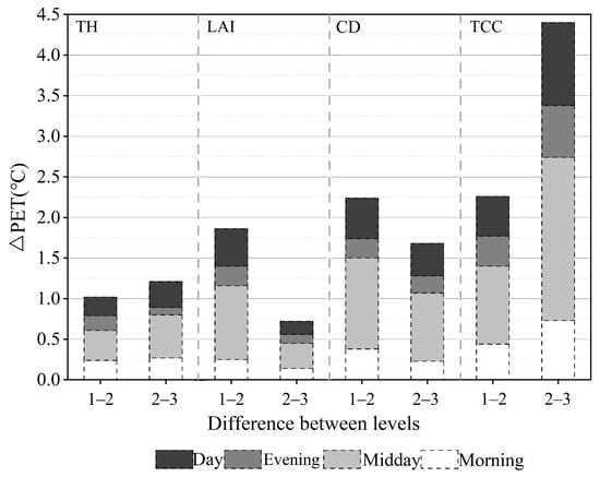 ΔPET between adjacent levels of each greening element during morning (6:00–8:00), midday (12:00–14:00), evening (18:00–20:00), and the whole day (0:00–23:00). Note on abbreviation—ΔPET: difference of physiological equivalent temperature.