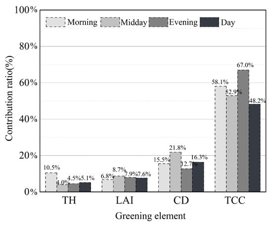 By comparing the PET differences (ΔPET) between adjacent levels of each greening element (Figure 9), we analyzed the importance of each element on PET and the differences in the impact between the different levels of each element. Overall, we observed temporal differences in the regulation of PET by each element. The largest ΔPET was observed during the midday period, while the morning and evening periods showed relatively smaller changes. This suggests that changing the level of greening elements has a stronger impact on regulating the thermal environment during midday, but a relatively weaker effect during the morning and evening periods.
